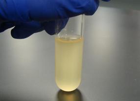 Sometimes solid, rather than liquid, growth media are required. Broth media can be made solid by adding agar, a gel like polysaccharide (big sugar) extracted from red algae. Broth with about 1.5% agar added will be liquid when heated, but solid at room temperature, making it easy to pour into a vessel, such as a Petri dish or test tube when hot. The solution then becomes solid once cooled.