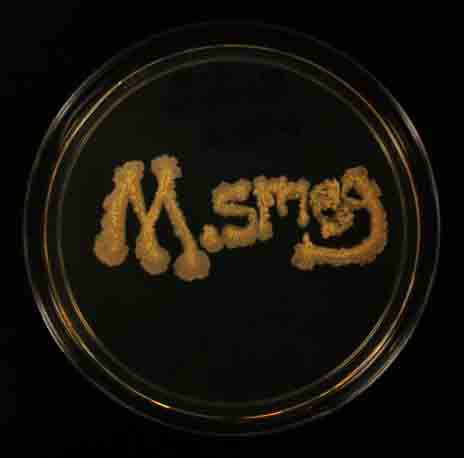 2. Safranin stain, last step of Gram-staining procedure; 3: M. smeg written in Mycobacteria smegmatis & growing on TSY agar; 4. Zones of inhibition from antibiotic discs on plate swabbed with liquid bacterial sample;