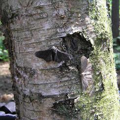 Typica and carbonaria morphs on the same tree. The light-coloured typica (below the bark's scar) is nearly invisible on this pollution-free tree, camouflaging it from predators.