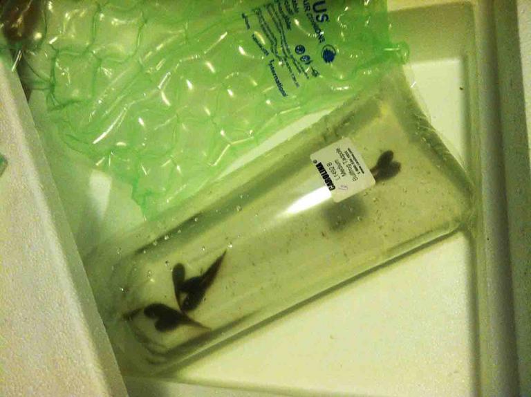 The photo to the right shows how the tadpoles arrived, in a plastic bag of water inside a Styrofoam container with a heat pack and bubble wrap. We were told the tadpoles were about 4 months old when shipped. The largest was nearly 7 centimeters long.
