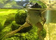 When the tadpoles developed into froglets and then adults, we made minor changes to the tank setup. The water level was lowered so that the tank was only 1/2 full and a brick was placed on top of an upside down pot to provide a place that the frogs can leave the water. The frogs eat earthworms, which we typically cut in half and place in a dish we made from the plastic lid of a container, with small holes drilled into it so that the dish doesn't fill with water.