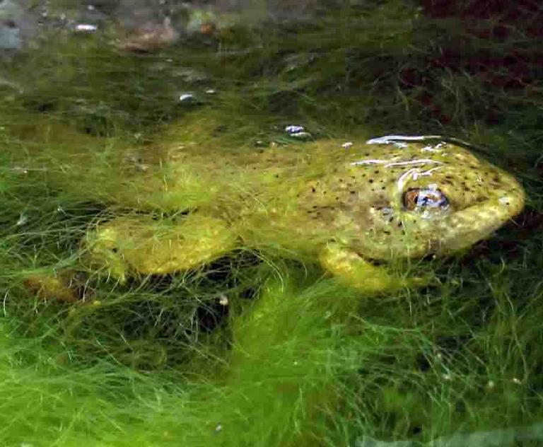 Tadpole metamorphosis proceeds relatively slowly until the front legs appear. Once that happens, the head begins to quickly, and dramatically, change shape (eyes migrating to top of head). Then the tail begins to reabsorb. Click on image to enlarge and expand view of film strip.