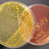 3. Mannitol Salt Agar. Left plate is growing mannitol+ pathogen Staphylococcus aureus. Right plate growing mannitol- normal floraStaphylococcus epidermidis.